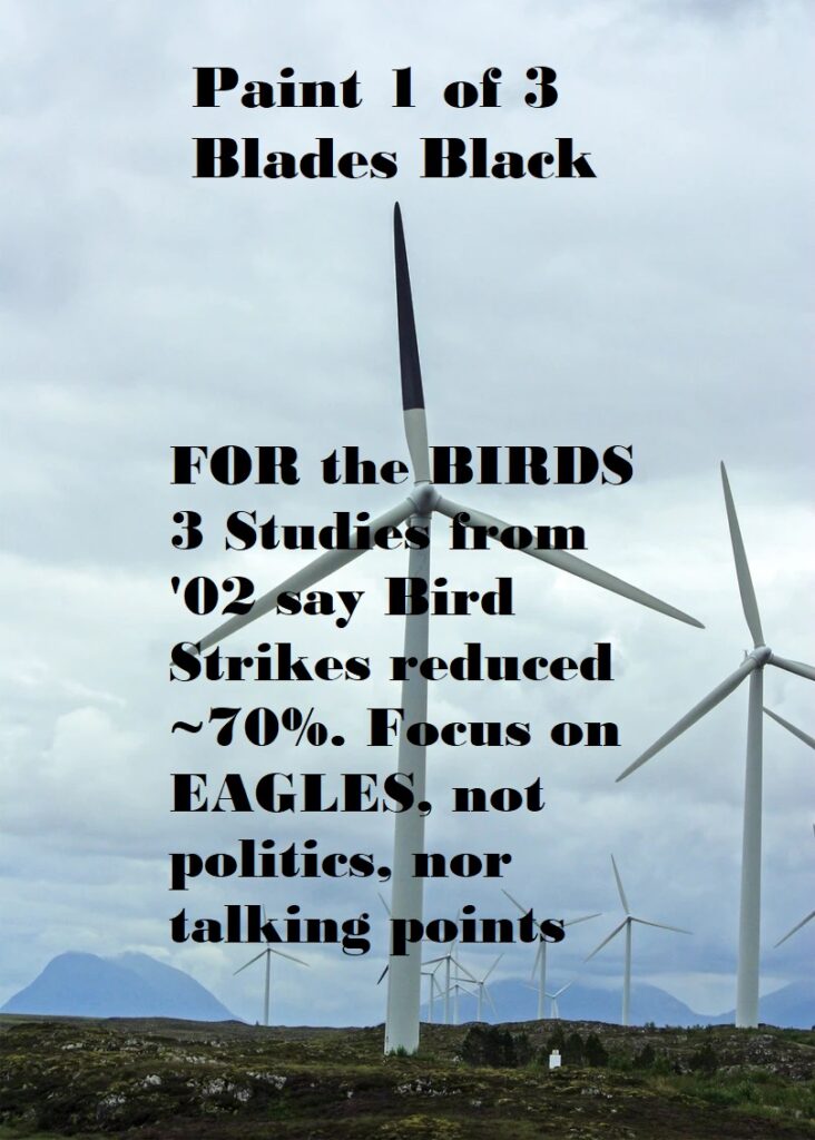 FOR the BIRDS: Why do so many birds including Eagles continue to get struck by Wind Turbine Blades. Is it the Wind Farms’ fault? Turns out that painting 1 of the 3 Blades BLACK reduces bird strikes about 70%. While the 1st study done by NREL occurred 1999-2002, stating Motion Smear caused difficulty in birds seeing the blades, painting 1 of 3 blades has occurred in 2 test cases both with reduced bird fatalities. Our focus regarding Birds is NOT Political candidates nor parties or yes/no for Wind Farms. Protecting Birds is the focus and the Birds if they could talk would want to sing about the Spin of the Blades rather than Political Spin or Spin for ‘Renewable Energies’. NREL Trial 1 Trial 2